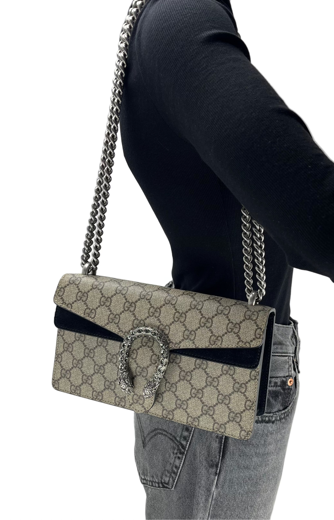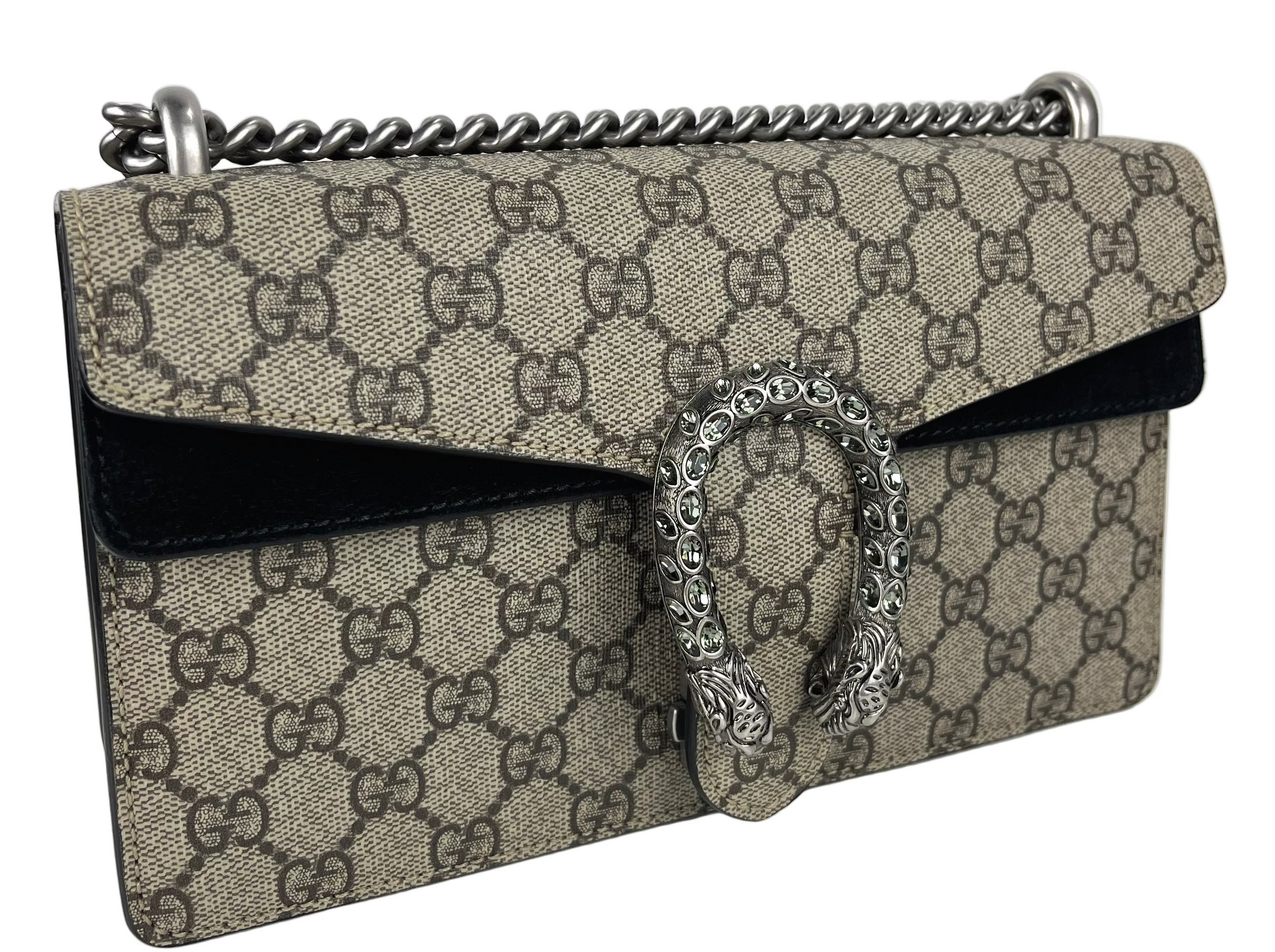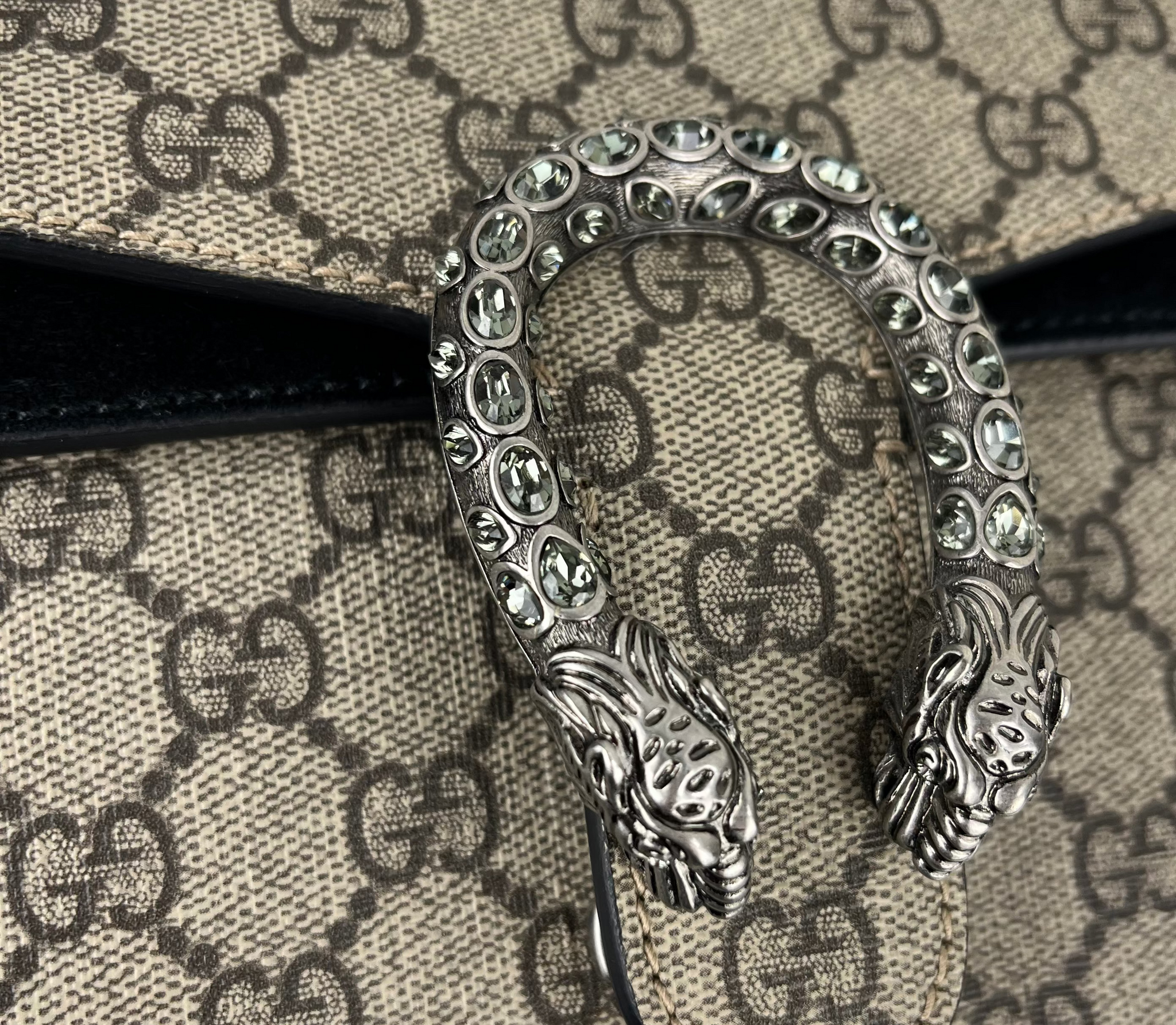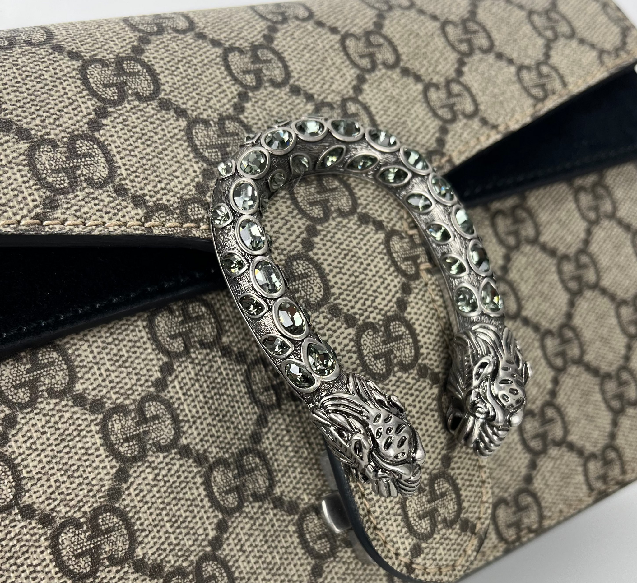 Authentic Gucci dionysus small embellished GG canvas and suede shoulder bag .
