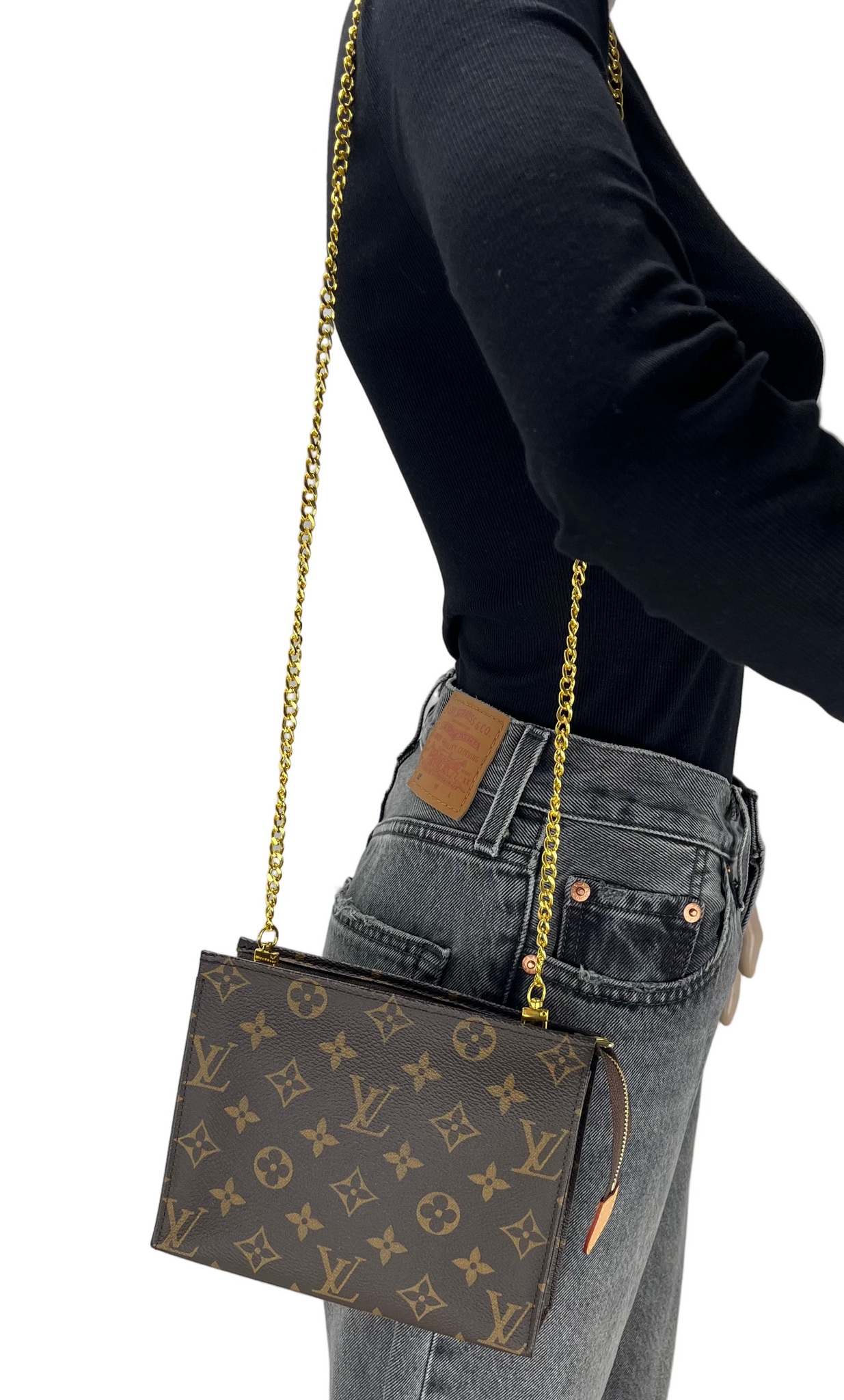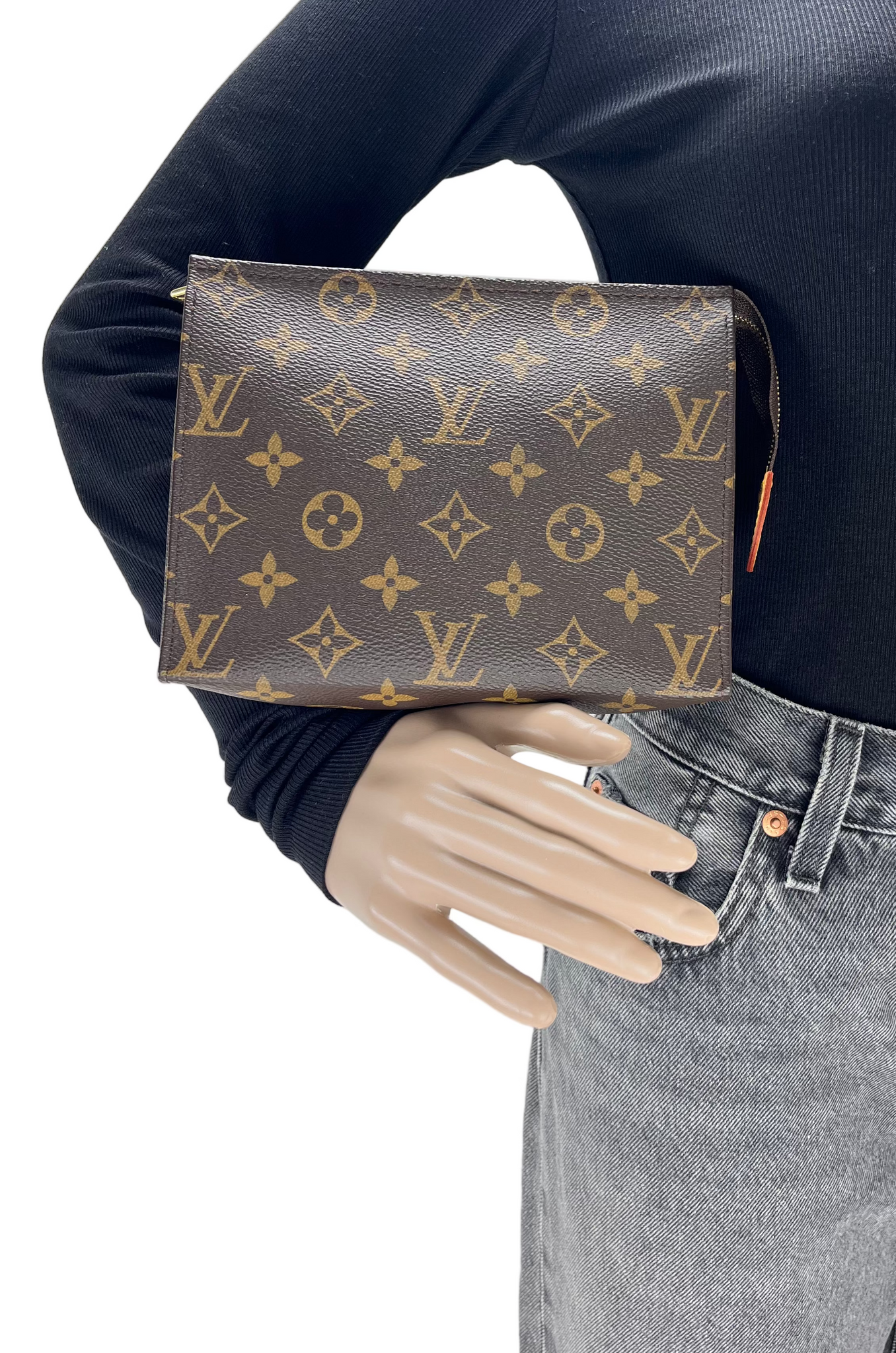 Authentic Louis Vuitton toiletry pouch 19. Washable lining. 19X15X6cm. Comes with a new insert from Zoomoni ( (hooks to attach) and a vachetta wristlet strap and chain ( not from Louis Vuitton)