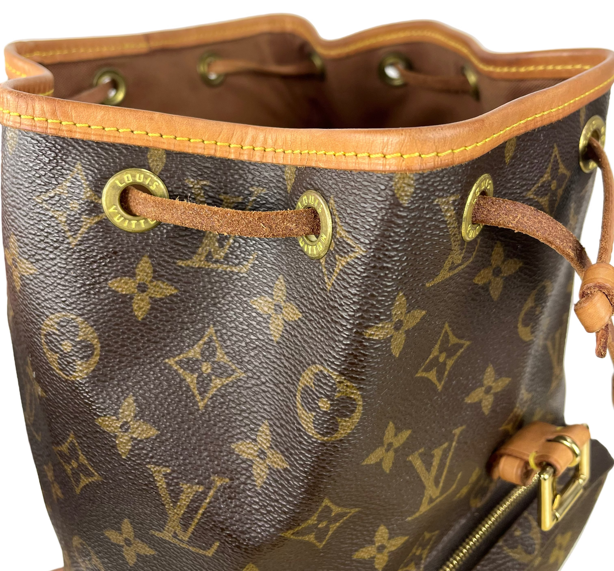 EXTERIOR: Medium to dark honey patina. Some marks, stains on the leather throughout. Canvas is in excellent shape. Drawstring is darker with spots and dryness.