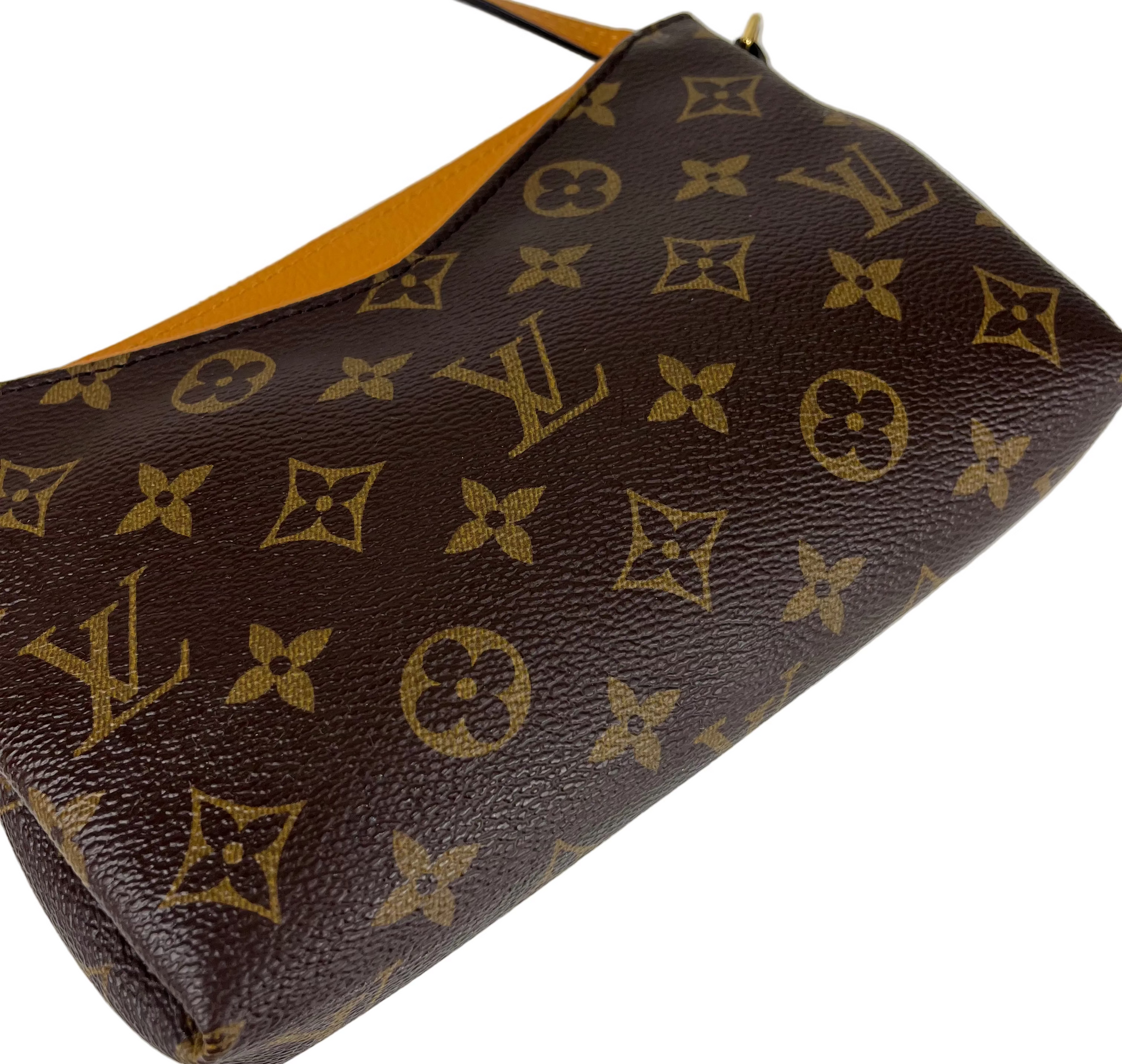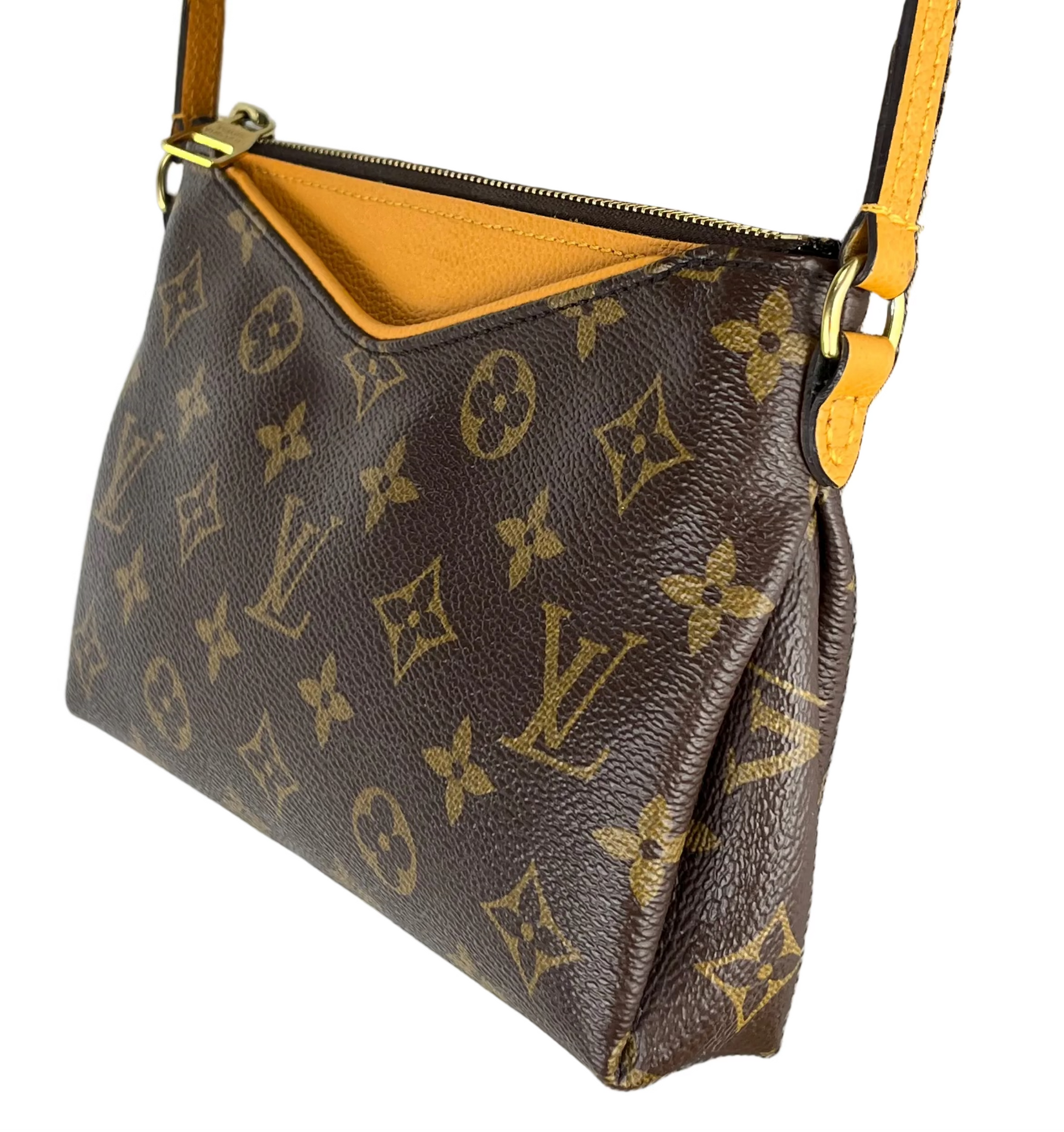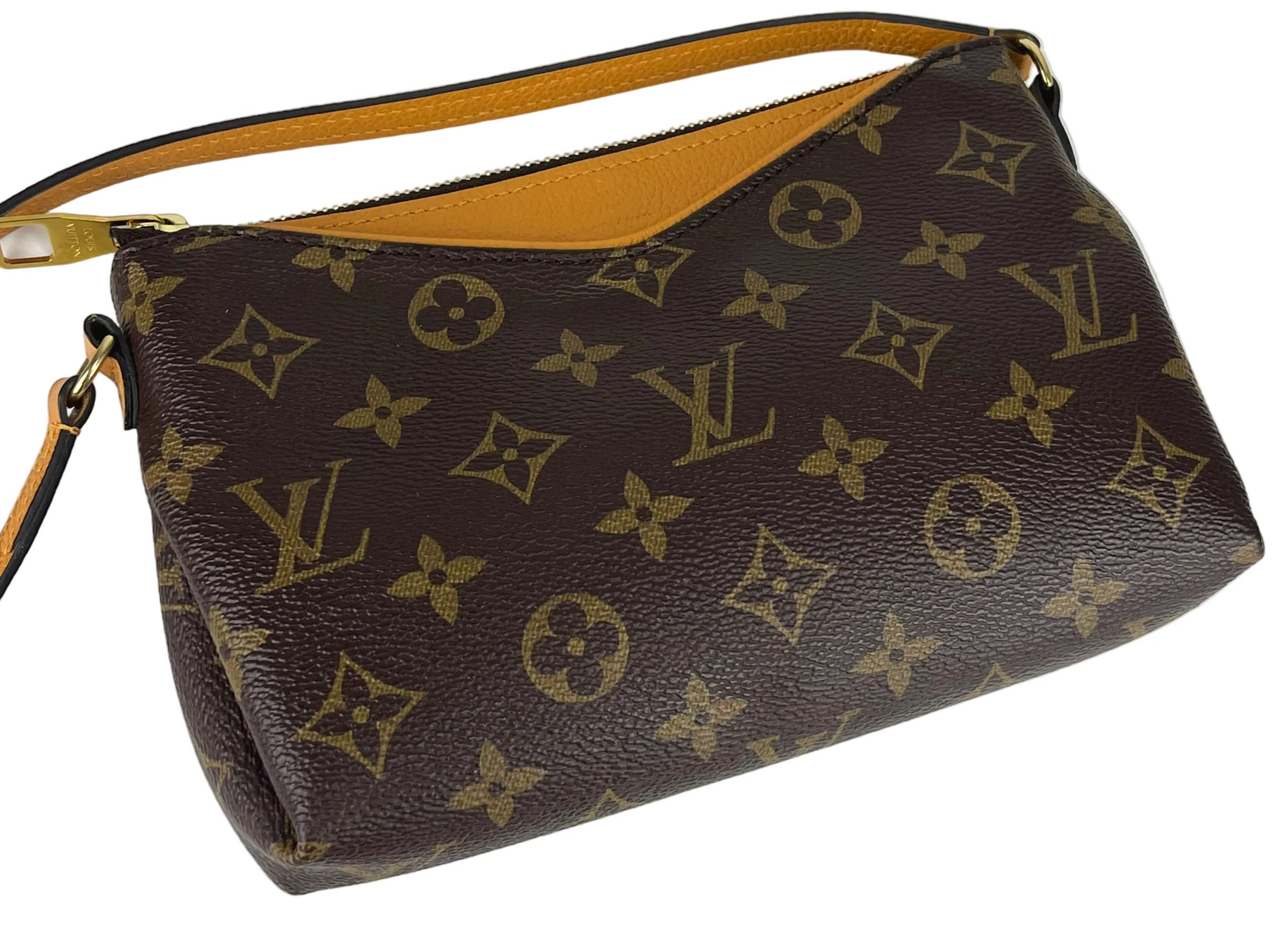 Authentic Louis Vuitton pallas clutch. Adjustable strap for cross bocy.. Monogram with saffron coloured leather details. This item is manufactured for Louis Vuitton staff uniform. 21X14X4cm