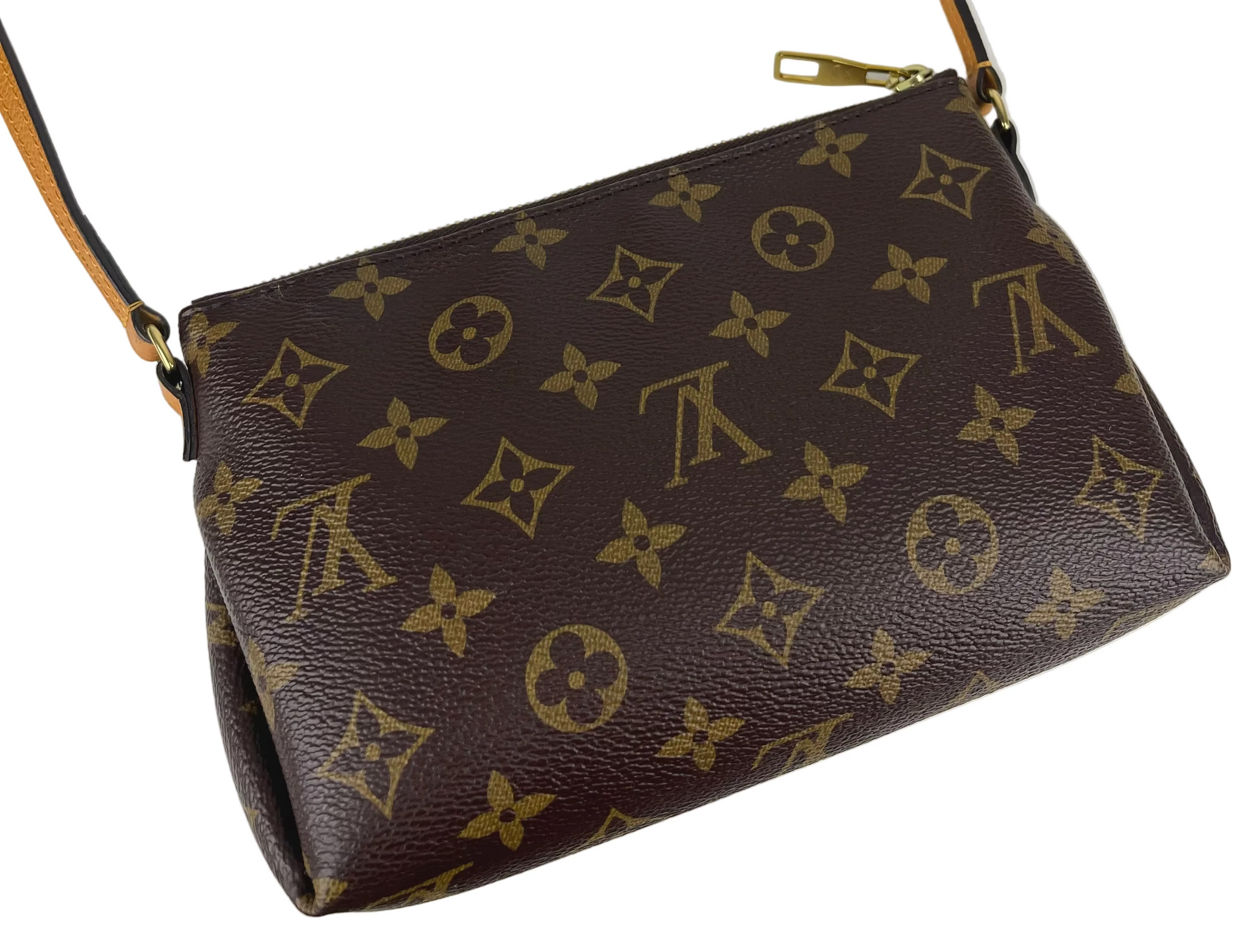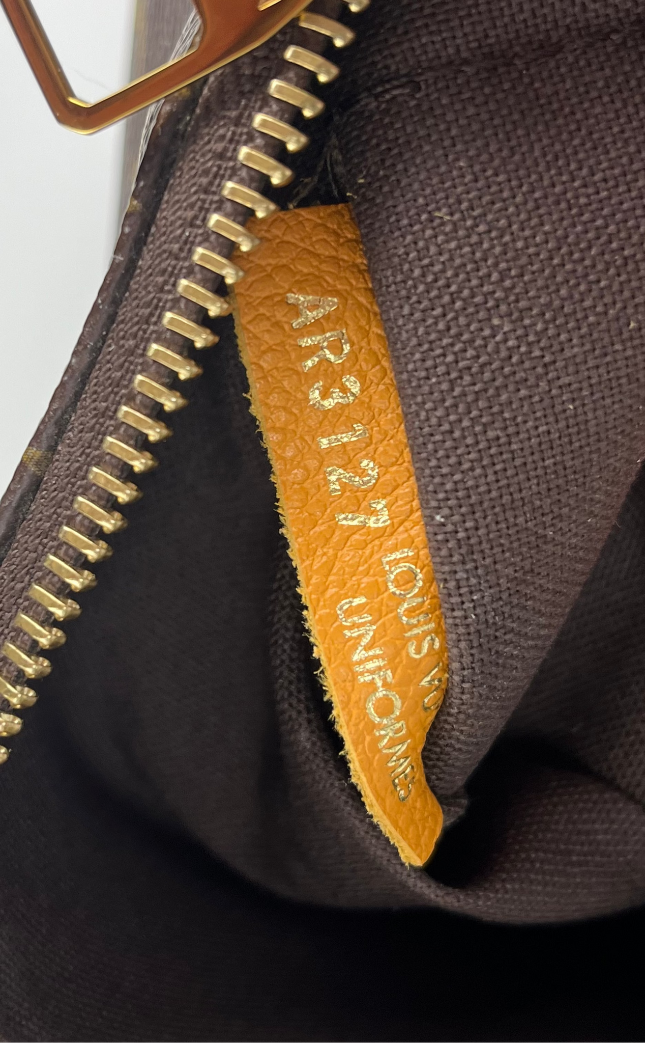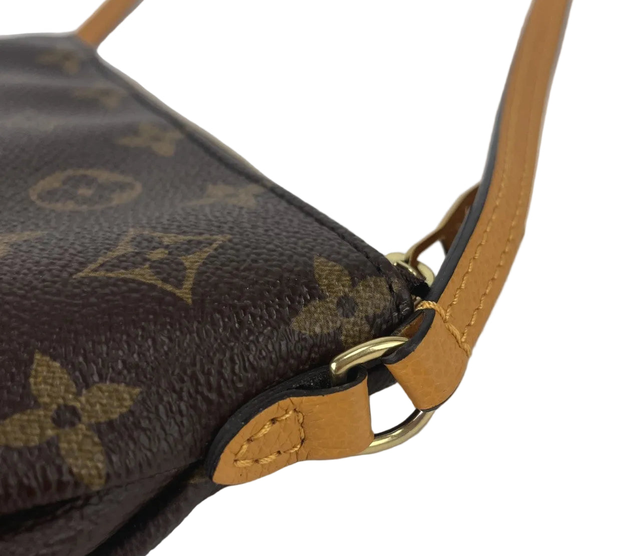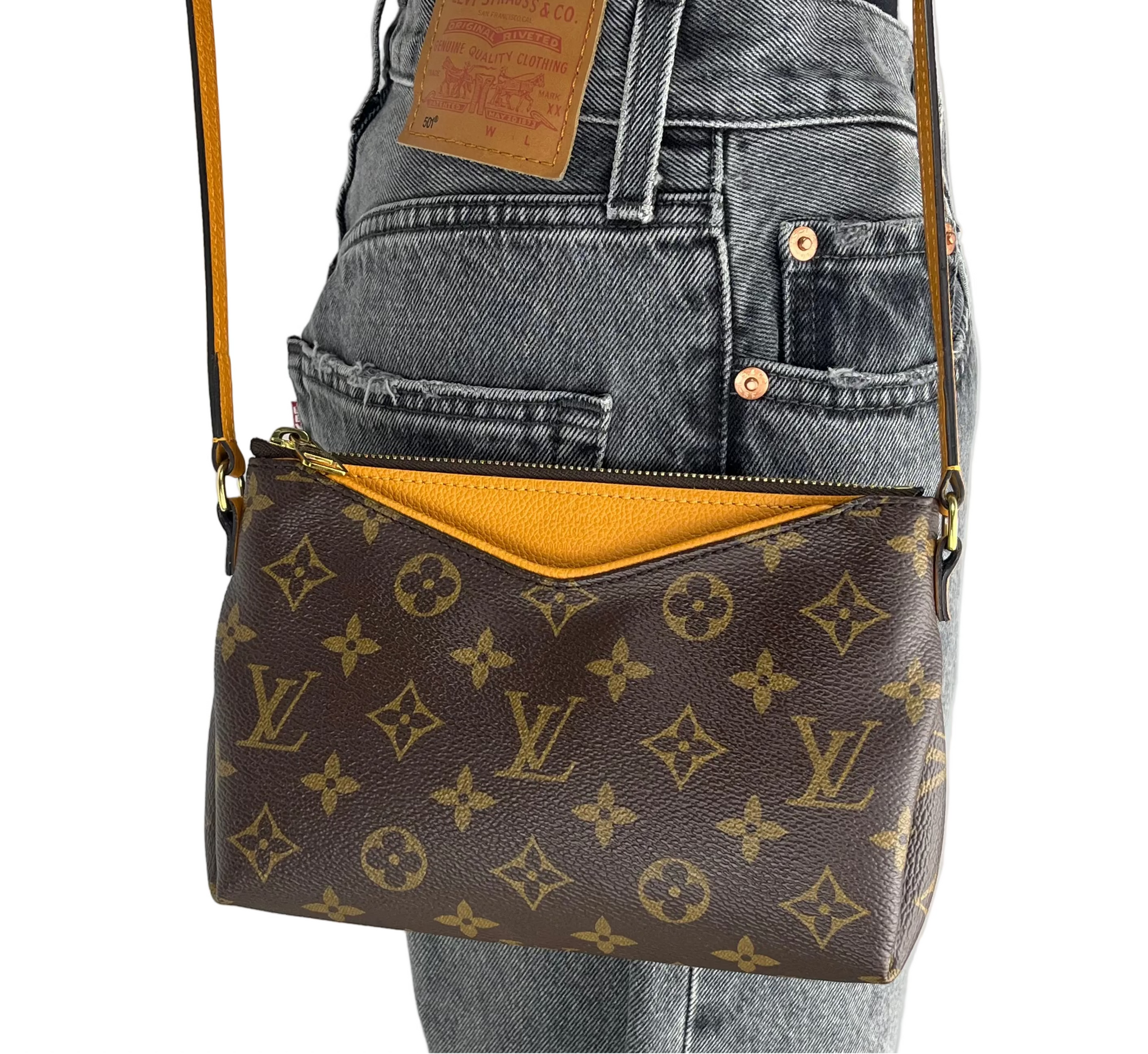 Authentic Louis Vuitton pallas clutch. Adjustable strap for cross bocy.. Monogram with saffron coloured leather details. This item is manufactured for Louis Vuitton staff uniform. 21X14X4cm